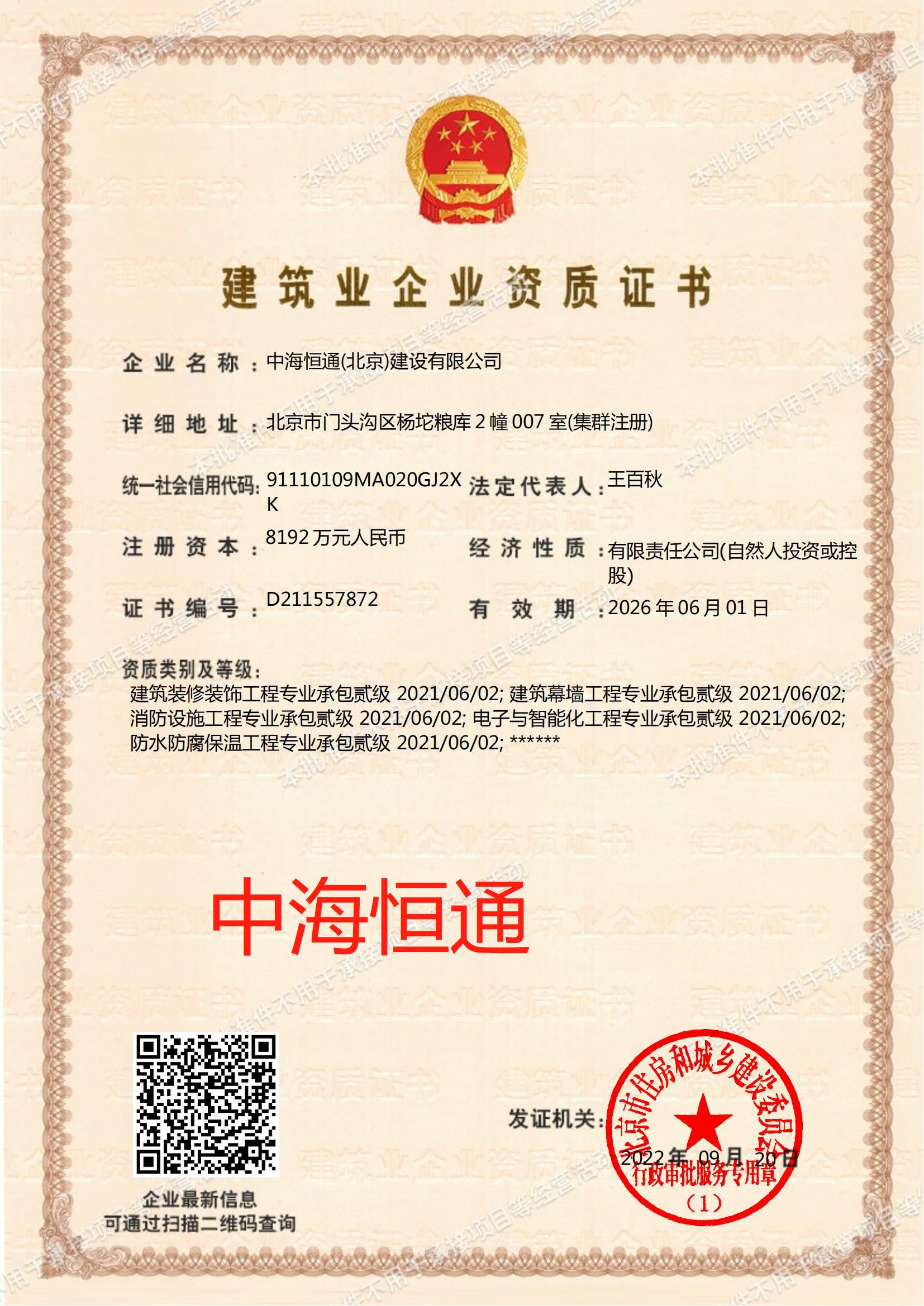 住建部中海恒通(北京)建設(shè)有限公司資質(zhì)查詢